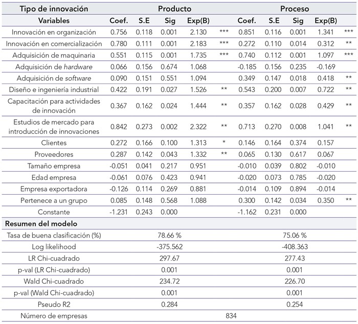 Cuando se analizan las variables de control, la única significativa es aquella referida a la pertenencia a un grupo, y solamente en la propensión de la innovación en procesos, con un coeficiente de 0.350 y con una significación de 0.05. Este resultado es contario al obtenido por Adeyeye, Jegede, Oluwadare y Aremu (2016), quienes analizaron las empresas de manufactura nigerianas y obtuvieron para las innovaciones en procesos un coeficiente positivo de 0.78, pero no significativo estadísticamente.