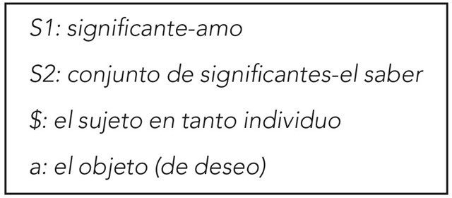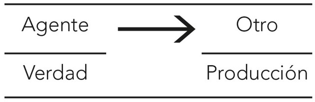 Como puede verse, hay un Agente que se dirige a Otro. Hay un saber, una Verdad. Y hay un objeto de deseo, de que se dé una Producción. Los elementos que se ubican en esos lugares, y que al ir desplazándose producen los cuatro discursos (el del amo, el de la universidad, el de la histérica y el del analista) son: