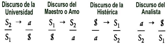 La teoría lacaniana de los discursos plantea cuatro lugares y cuatro elementos: S1, S2, $, a. Cada discurso depende de la posición que los elementos simbólicos ocupen. Esos lugares son: