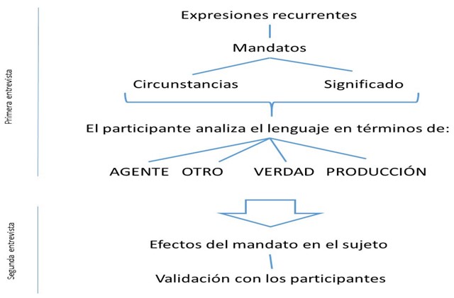 En un primer momento, con la primera ronda de entrevistas, se fueron identificando los mandatos más recurrentes en el entorno organizacional. Por tanto, fue necesario indagar a los participantes por los términos o expresiones que los trabajadores comúnmente escuchan en su cotidianidad laboral. Después se analizó cuáles de esas expresiones son consideradas como mandatos por los mismos entrevistados. Luego se sistematizaron y organizaron dichos mandatos de acuerdo con: a) las circunstancias en las que se producen y b) el significado que le asignan los participantes. Esto con el propósito de identificar los elementos y lugares de los discursos lacanianos: un Agente (Significante-amo) que se dirige a Otro (el sujeto), un saber, una Verdad, y un objeto de deseo, de que se dé una Producción (figuras 1 y 2).