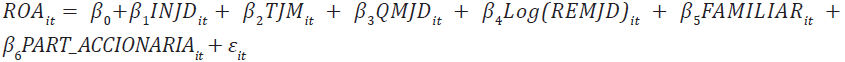 (1)Donde i indica la empresa, t indica el año, Eit es el término de error, roa es la medida de valor financiero empresarial, INJD, TJM, QMJD Y LOG_REMJD son las variables independientes de interés. FAMILIAR Y PART_ACCIONARIA son variables de control que permiten considerar factores que tienen alto potencial en la explicación de la roa. En el modelo se usan coeficientes .1, .2,…,.6 para identificar el efecto de cada variable sobre el ROA (Correa & Hernández, 2018).