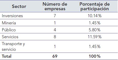 Inicialmente, se tenía una matriz de 345 datos, ya que no todos estaban completos, se redujo a una base final de 197. Esto con el fin de trabajar con información completa para que los resultados no estuvieran distorsionados y se pudiera garantizar una seguridad en los hallazgos. En la siguiente tabla se mostrará un resumen del número de empresas que pertenecen a cada sector.