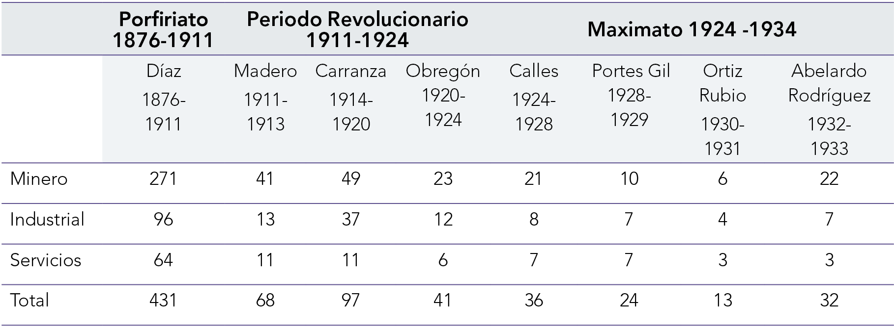 En la tabla 4 se puede observar que durante los 30 años que duró la dictadura de Porfirio Díaz,1 las empresas con mayor participación fueron las del sector primario, principalmente empresas mineras, fundamentalmente porque se visualizó con grandes esperanzas de crecimiento para un país que, en ese momento, contaba con un alto índice de pobreza. Además, en esa época los funcionarios responsables empezaron a descubrir que México se encontraba encima de unos grandiosos yacimientos mineros en varias de sus regiones, por lo que el Presidente Porfirio Díaz otorgó apoyos y concesiones principalmente a las empresas extranjeras, por ser estas las que en ese momento tenían mayor capacidad financiera, lo cual traería bonanza a la economía mexicana.