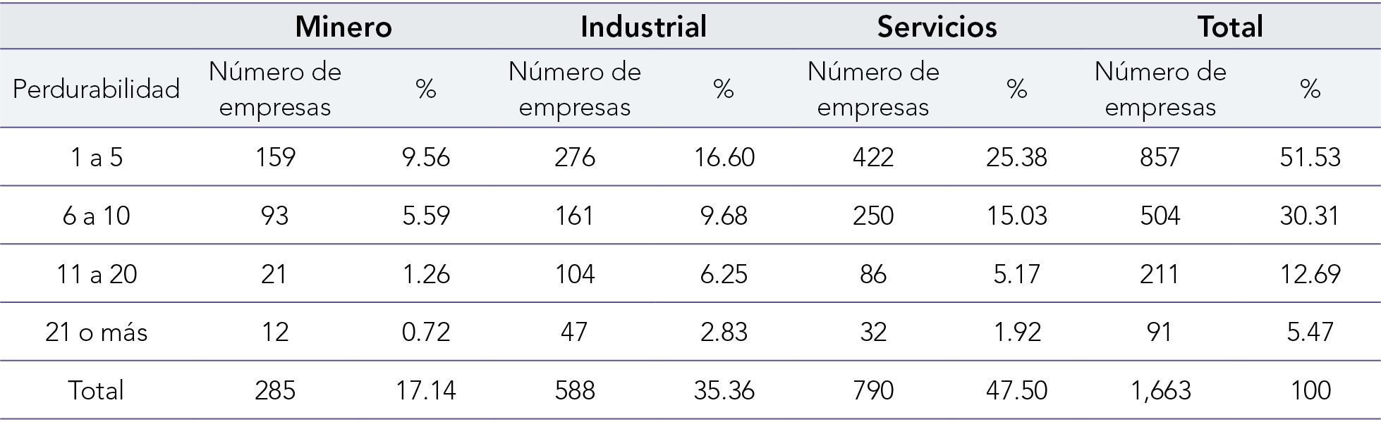 La tabla 3 muestra como resultado del análisis de las 1663 bursátiles en la BMV, la perdurabilidad acumulada por sector económico durante 121 años, pudiéndose observar que, en primer lugar, se encuentran las empresas del sector servicios con 47.50 %, el segundo lugar lo ocupan las empresas del sector industrial con 35.36 % y, por último, las empresas mineras con 17.14 % del total.