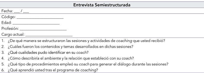 Se obtuvo el permiso oficial de la clínica para poder aplicar dos técnicas para la recolección de datos: la entrevista en profundidad (tabla 1) y la observación directa, dirigidas a registrar los significados y experiencias de los coachees.