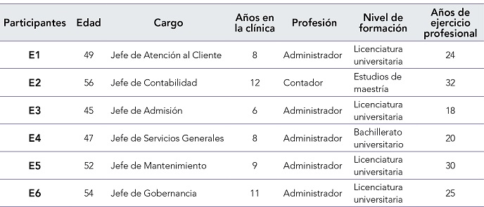 La muestra estuvo constituida por 6 entrevistados varones provenientes del área administrativa de la clínica, cuyas edades promediaron los 50 años (tabla 2). Los puestos de los coachees corresponden a jefaturas con más de una década laborando en la institución de salud analizada. Se adhirió voluntariamente al programa el 80% de los participantes preseleccionados, en un muestreo por conveniencia, considerando que este tipo de programas se implementan con un número reducido de personas.