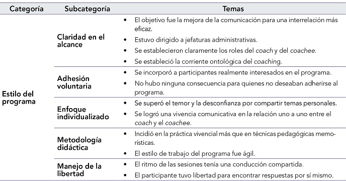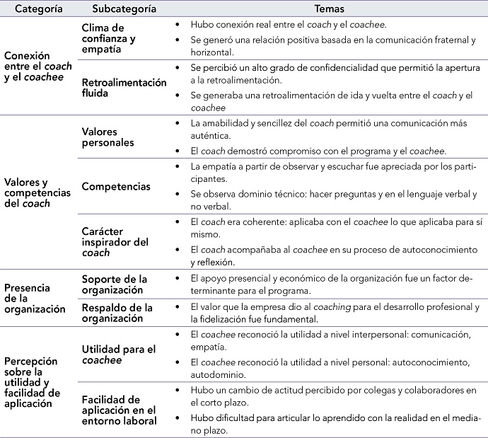 Los coachees reportaron que el programa produjo un impacto significativo en su forma de interactuar con los demás, así como en su concepción sobre el coaching en el ámbito corporativo. Los entrevistados destacaron cinco aspectos relevantes en la implementación: a) estilo del programa, b) conexión entre el coach y el coachee, c) valores y competencias del coach, d) presencia de la organización y e) percepción sobre la facilidad de aplicación. Dichos aspectos se configuran como categorías (tabla 3), de las cuales se desprenden subcategorías que las explican y estas, a su vez, se dividen en temas.