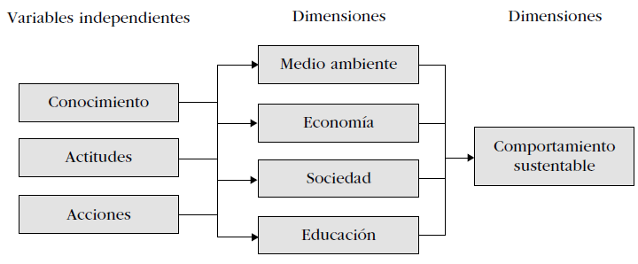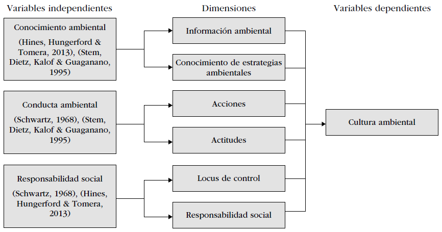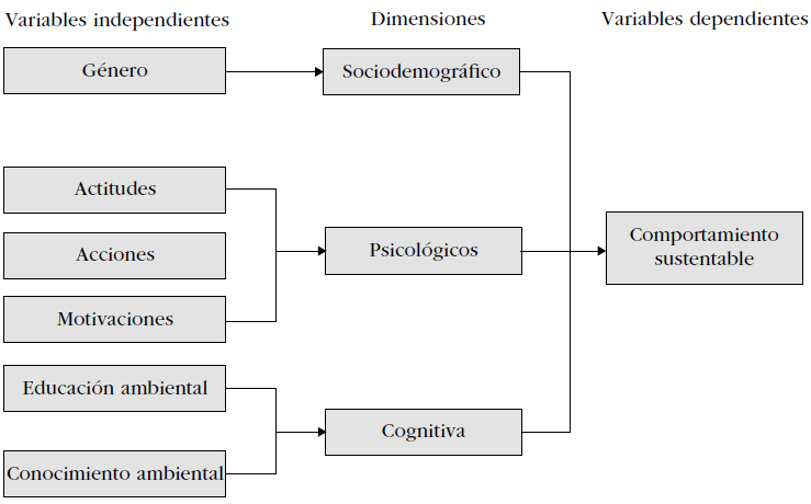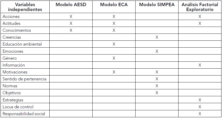 Entretanto, el modelo eCa, además de considerar conocimientos, actitudes y comportamientos, añade variables como motivaciones, educación y género, mientras que la validación del modelo de Hines, Hungerford y Tomera (2013), mediante el análisis factorial exploratorio, aparte de considerar acciones y actitudes, agrega variables como información, estrategias, locus de control y responsabilidad social.