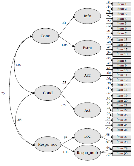 De la misma forma, las correlaciones entre las variables latentes conocimiento ambiental (Cono), conducta ambiental (Cond) y responsabilidad social (Respo_soc) son significativas, aunque existe mayor correlación entre el conocimiento ambiental y la conducta ambiental de 1.07, seguido de una correlación entre conducta ambiental (Cond) y responsabilidad social (Resp_soc) de 0.85, y, finalmente, una correlación menor pero significativa entre conocimiento ambiental (Cono) y responsabilidad social (Respo_soc) de 0.75, lo cual indica una codependencia del conocimiento ambiental para generar una conducta ambiental y viceversa, pero, a su vez, de manifestar una responsabilidad social por parte de los estudiantes universitarios.