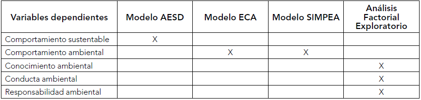 Los modelos descritos tienen similitudes en cuanto a las variables independientes, que están asociadas a la medición del comportamiento ambiental. El conocimiento ambiental que pareciera ser una variable clave solo se identifica en el modelo eCa y eaDs, la variable información ambiental presenta una asociación positiva con el conocimiento ambiental.