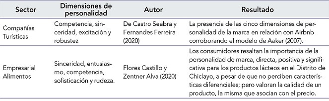 En comparación con otros estudios del año 2020 que implementaron el modelo de Aaker (1997) de personalidad de marca, se compara esta investigación con otras tres respecto al sector empresarial de alimentos, empresarial de comunicaciones y compañías turísticas.