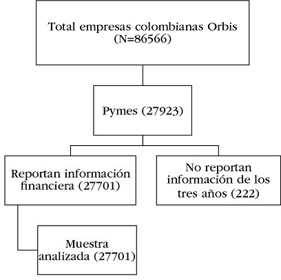 Del total de empresas colombianas registradas en la base de datos Orbis, que constituyen el marco poblacional del presente estudio, se filtró por las que cumplen el criterio de pyme, según el Decreto 957 de 2019, posteriormente, se seleccionaron las que reportan información financiera completa para, finalmente, obtener una muestra de 27701 pymes.