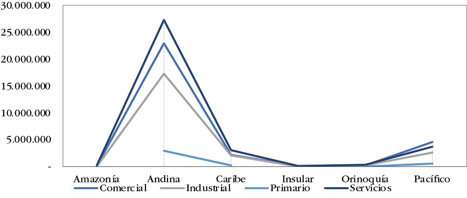 Las empresas en Colombia presentan crecimiento en los sectores comercial, industrial y de servicios, a diferencia del sector primario, que, aunque cuenta con una gran cantidad de empresas, se clasifican como microempresas, e incluso, muchas actividades relacionadas con el sector agropecuario y minero se desarrollan de manera informal (Saavedra & Hernández, 2008). A continuación, se presenta en detalle la concentración de pymes por sectores de la economía, dentro de cada una de las regiones, con base a la suma de la cifra de negocio.
