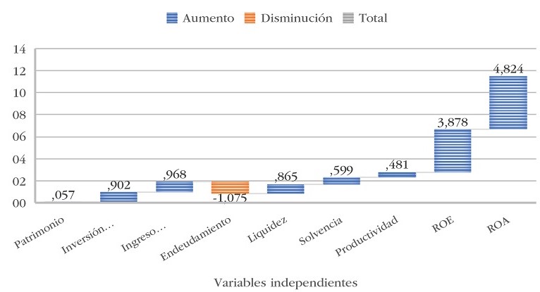 La figura 4 facilita la visualización del resultado consolidado del análisis de regresión múltiple, en el cual se compararon dos grupos de variables, cinco relacionadas con la rentabilidad y cinco con la inversión, respecto a la variable dependiente competitividad. Los valores que se presentan en el gráfico corresponden al coeficiente obtenido en el modelo.