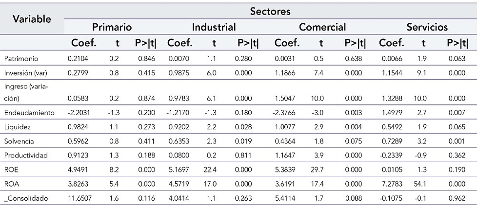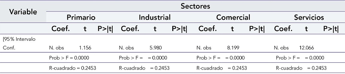 De acuerdo con los resultados, se puede afirmar que el modelo implementado es significativo, debido al resultado de Prob>F=0.0 para todos los sectores; y las variables independientes, explican la variable dependiente con un intervalo de confianza del 95 %. El coeficiente y el P valor (P>|t|) se analizaron de manera independiente por cada sector.