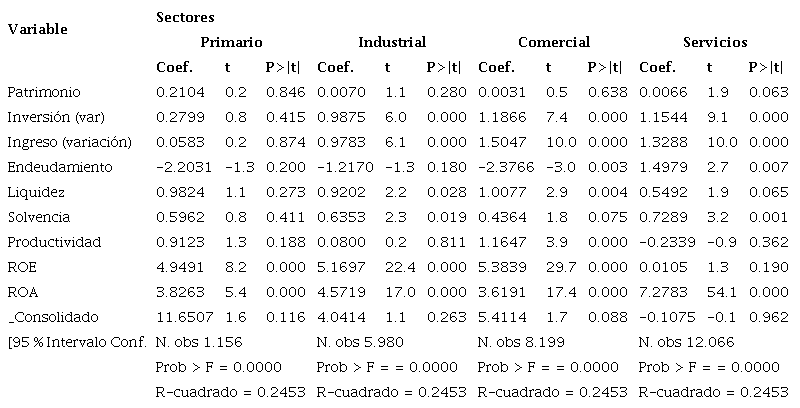 De acuerdo con los resultados, se puede afirmar que el modelo implementado es significativo, debido al resultado de Prob>F=0.0 para todos los sectores; y las variables independientes, explican la variable dependiente con un intervalo de confianza del 95 %. El coeficiente y el P valor (P>|t|) se analizaron de manera independiente por cada sector.