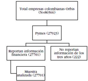 Del total de empresas colombianas registradas en la base de datos Orbis, que constituyen el marco poblacional del presente estudio, se filtró por las que cumplen el criterio de pyme, según el Decreto 957 de 2019, posteriormente, se seleccionaron las que reportan información financiera completa para, finalmente, obtener una muestra de 27 701 pymes.