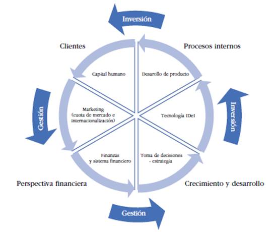 Como apoyo a la gestión, el cuadro de mando integral, propuesto por Kaplan y Norton (1996), plantea una estrategia basada en objetivos e indicadores, desde el área financiera, incorporando las perspectivas de clientes, procesos internos y el crecimiento a través del desarrollo innovador.