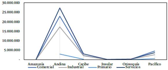 Las empresas en Colombia presentan crecimiento en los sectores comercial, industrial y de servicios, a diferencia del sector primario, que, aunque cuenta con una gran cantidad de empresas, se clasifican como microempresas, e incluso, muchas actividades relacionadas con el sector agropecuario y minero se desarrollan de manera informal (Saavedra & Hernández, 2008). A continuación, se presenta en detalle la concentración de pymes por sectores de la economía, dentro de cada una de las regiones, con base a la suma de la cifra de negocio.