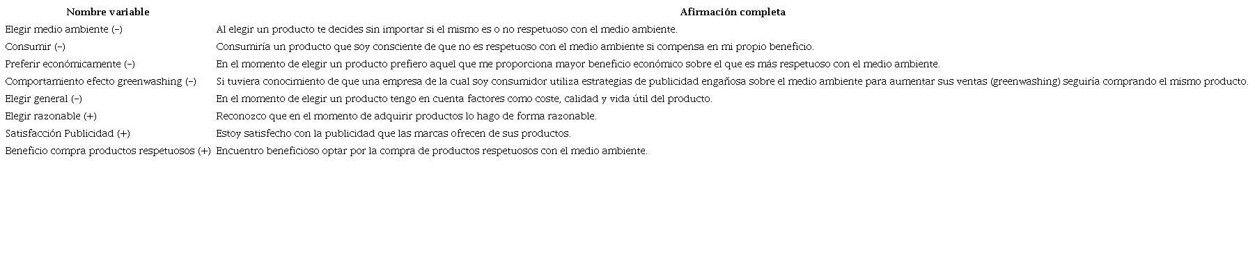 En las preguntas de comportamiento, se incluyen las siguientes afirmaciones (tabla 1), que se tienen que valorar en una escala del 1 al 7, donde 1 significa "totalmente en desacuerdo" y 7 significa "totalmente de acuerdo". Metodológicamente, se ha seleccionado esta escala Likert de 7 puntos para evaluar estas afirmaciones de comportamiento ante una escala de 5 puntos porque, como sucede con otras medidas basadas en la percepción (por ejemplo, la calidad de vida), la extensión de este rango de respuesta sistemáticamente aumenta la sensibilidad de las respuestas, pero, a su vez, no implica un perjuicio sistemático en la fiabilidad de la escala (Cummins & Gullone, 2000).