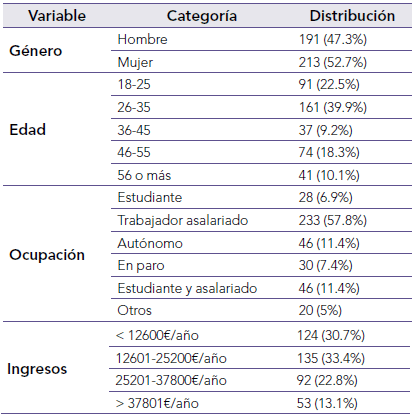 Como podemos observar en la tabla 2, la muestra está compuesta por 407 individuos, de los cuáles el 53% (216 individuos) son mujeres y el 47% (191 individuos) son hombres. De estos, observamos en la misma tabla, que las franjas de edad con mayor representación corresponden a las de 18 a 35 años, siendo estos el 58% del total de los encuestados. La mayoría de los encuestados son trabajadores asalariados (57.8%), seguidos de autónomos (11.4%) y estudiantes y asalariados (11.4%). En referencia a los ingresos, existe una distribución bastante equilibrada entre los distintos grupos: un 30.7% cobra menos de 12600 euros brutos anuales; un 33.4% cobra de 12601 a 25200 euros brutos anuales; un 22.8% cobra de 25201 a 37800 euros anuales; y, en el último grupo, el menos numeroso, tenemos un 13.1% que cobra más de 37801 euros brutos anuales.