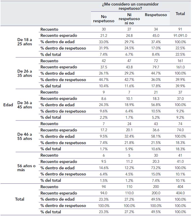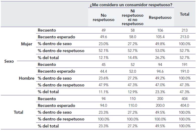 Tal como podemos observar en la tabla 3, no existen diferencias sustanciales en la distribución de los individuos según género y el hecho de que sean respetuosos o no, indicando una relación no significativa a nivel de la población y débil a nivel de la muestra. En este sentido, el género no es un factor diferenciador del comportamiento más o menos responsable de los consumidores, ya que se perciben unas distribuciones muy parecidas en hombres y mujeres. El resultado de la V Crámer es de 0.007 y su significación de 0.990. Podemos corroborar que, como se acaba de comentar, la relación entre sexo y consumidor respetuoso es casi nula y no significativa.