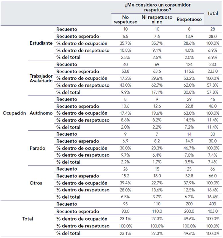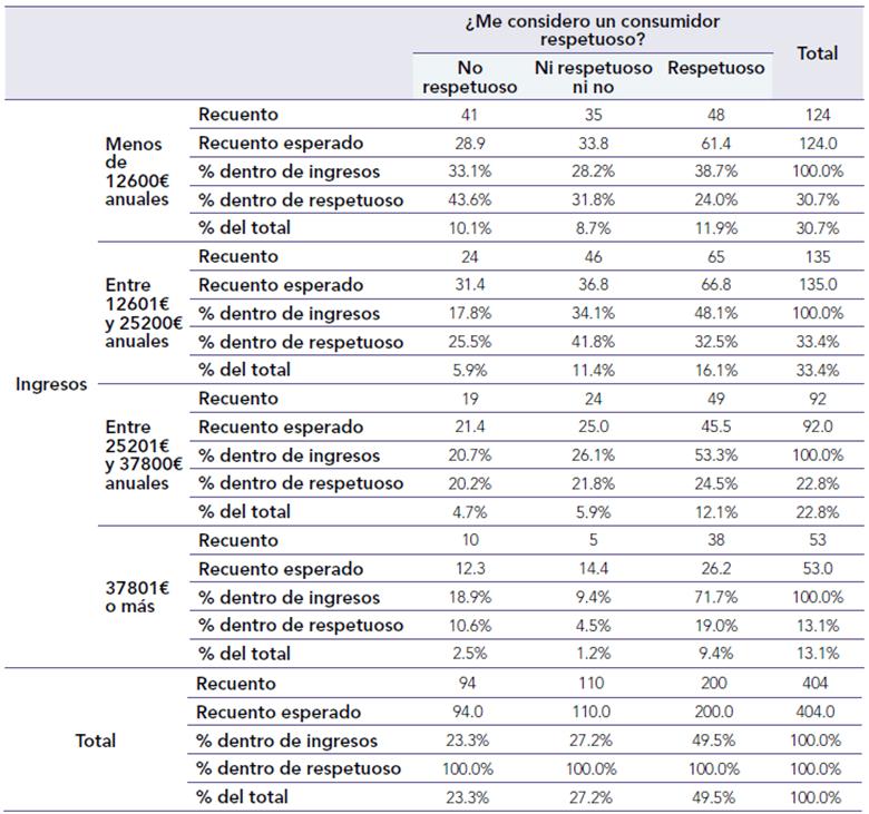 En conclusión, existen ciertas características sociodemográficas que se relacionan significativamente con el hecho de ser respetuoso en el proceso de compra. En este estudio se observa que puede ser determinante de ser más o menos respetuoso, por ejemplo, la edad, los ingresos o la ocupación.