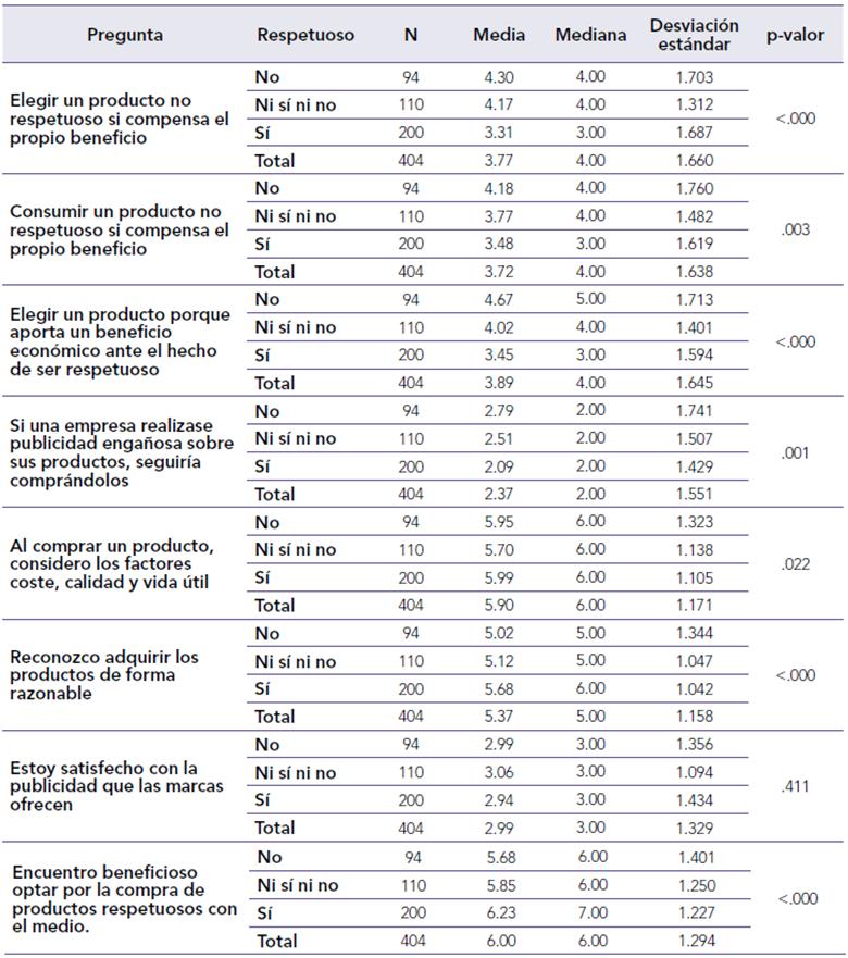 En la tercera afirmación, sobre el hecho de consumir un producto beneficioso económicamente por encima del respetuoso con el medio ambiente, lógicamente, los primeros en hacerlo serían los no respetuosos (media = 4.67), seguidos de los ni respetuosos ni no (con una media de 4.02) y, por último, los Respetuosos (media = 3.45). Existen diferencias significativas entre grupos (p-valor < .000). Si se implementan comparaciones múltiples, se puede observar que existen diferencias significativas entre todos los grupos. En la cuarta afirmación, con perspectiva negativa, sobre si seguiría comprando los productos si una empresa realizase publicidad engañosa sobre ellos, los primeros en seguir comprándolos serían, lógicamente, los no respetuosos (media = 2.79), seguidos de los ni respetuosos ni no (media = 2.51) y, por último, los respetuosos (media = 2.09). Existen diferencias significativas entre grupos (p-valor = .001). En las comparaciones múltiples, se puede observar que existen diferencias significativas entre los respetuosos y el resto.