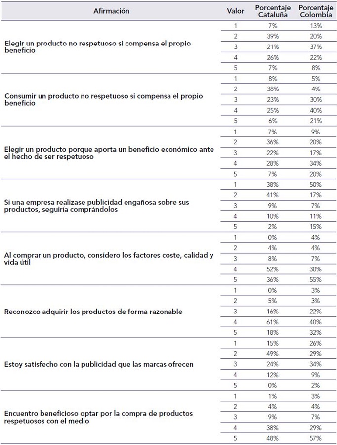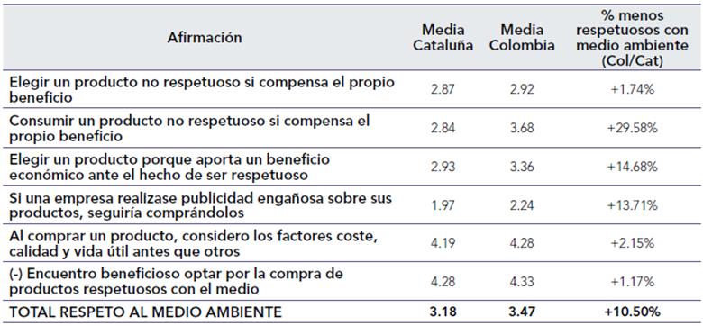 En esta comparativa se eliminan las preguntas 6 y 7, dado que no aportan información con relación al nivel de respeto por el medio ambiente de los encuestados. En una escala de 1 a 5, mostrando un mayor respeto hacia el medio ambiente cuanto más cerca de 1, la media ponderada de los indicadores arrojados por la encuesta realizada en Cataluña alcanza un valor de 3.18, mientras que la de Colombia llega a 3.47, una cifra sensiblemente superior. Si se concede un valor 100 al indicador obtenido en la encuesta realizada en Cataluña, se concluye que los consumidores colombianos son un 10.5% menos respetuosos con el medio ambiente que los catalanes.