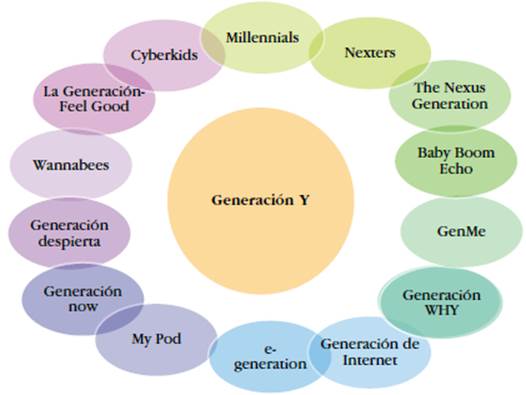 Esta generación recibe nombres tales como Millennials (por haber vivido su niñez al inicio del milenio); Generation Y (por la continuidad con la generación anterior la X); Nexter o the Nexus Generation, Baby Boom Echo (por tener características en común con los Baby boomers) (Glass, 2007; Ng et al., 2010); GenMe, (refiriéndose a su egocentrismo) (Barkhuizen, 2014; Twenge, 2010; Twenge & Campbell, 2008); y Generación WHY, (por la analogía fonética con la letra Y en Inglés y como expresión del carácter crítico que suele caracterizar a la mayoría de la generación) (García Lombardía et al., 2008). Otras denominaciones incluyen Generación de Internet o e-generation; My Pod; generación now; generación despierta (De & Su, 2011); Wannabees; la Generación-Feel Goody Cyberkids (Stanimir, 2015). Si bien esta generación es denominada de muchas maneras que se agrupan en la figura 1, las más aceptadas y popularizadas son Millennials y Generación Y. Por tanto, estas dos últimas denominaciones se utilizarán a lo largo de este documento.
