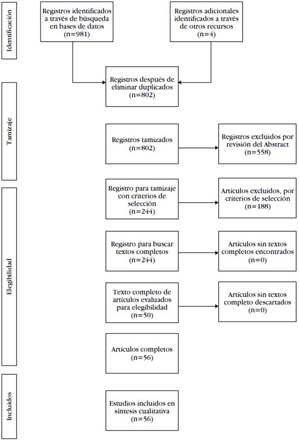 La Revisión Sistemática de Literatura se lleva a cabo en tres grandes etapas. En la primera, se elabora el protocolo que guía el proceso de revisión. Esta etapa le permite al investigador conocer a fondo un tema, sus antecedentes y categorías y, así mismo, le brinda herramientas para establecer su pregunta de investigación. La segunda etapa es la revisión en sí misma, que necesariamente debe tener una estrategia de búsqueda clara, como la selección de palabras clave, la ecuación de búsqueda, las bases de datos y los criterios de inclusión y exclusión para seleccionar los documentos. Finalmente, la tercera se refiere a la creación y divulgación del reporte o resultado de la investigación (Chicaíza-Becerra et al., 2017).
