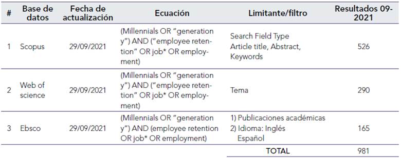 Para dar inicio al proceso de investigación, se realizó una búsqueda de tesauros relacionados con todos los términos asociados a la generación del milenio. De igual manera, con los términos empleo, retención, trabajador y trabajo. Se realizaron diferentes combinaciones de ecuaciones de búsqueda descartando tesauros que no fueran relevantes e incluyendo palabras clave como millennials, generation y, employee retention, job y employment.