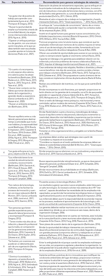 Por esta razón, durante la revisión de la literatura, se han mencionado algunas recomendaciones para mejorar la retención de esta generación de trabajadores. A continuación, la tabla 3 sintetiza y relaciona las expectativas asociadas a las características de la generación del milenio con su respectiva recomendación según los autores: