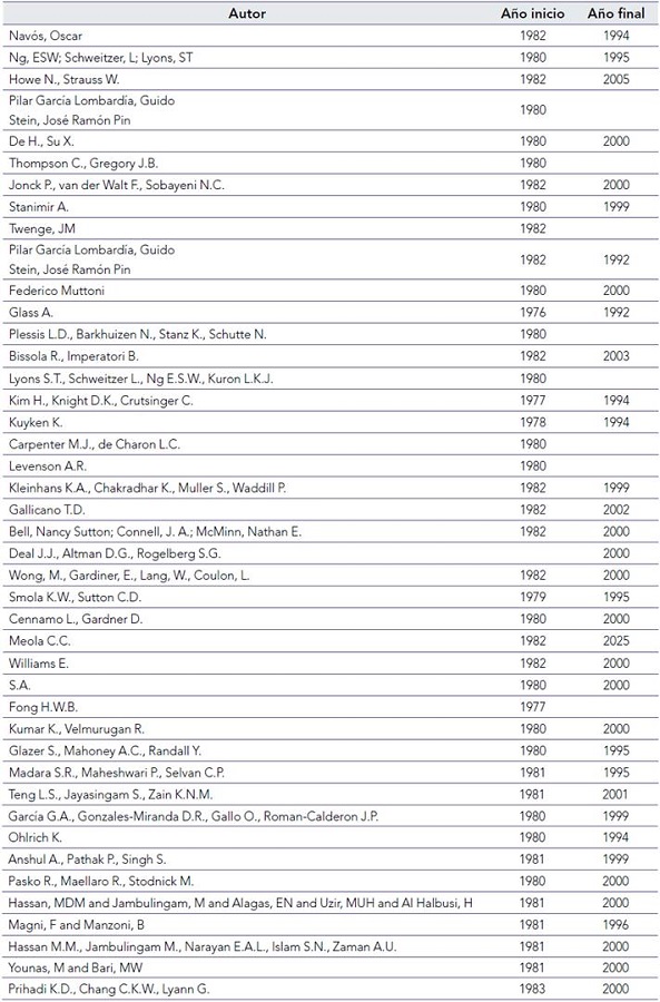 La cohorte generacional millennial, también denominada Generación Y, toma como rasgo común el rango de años en que nacieron. Según los autores de la revisión de literatura que se presentará a lo largo de este documento, el periodo inicia entre 1977 y 1983 y culmina entre 1992 y 2005. Teniendo en cuenta que no existe un consenso sobre las fechas exactas que esta generación comprende, para efectos de este artículo, se determina un promedio redondeado hacia arriba y se toman las fechas de 1980 al 2000 (anexo 1).
