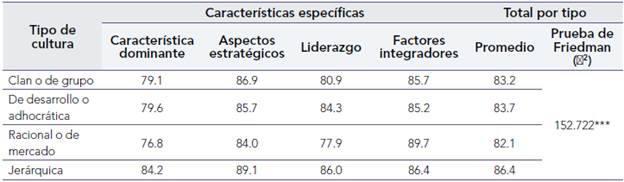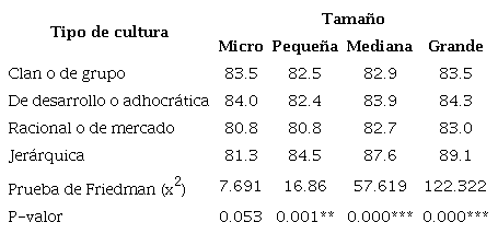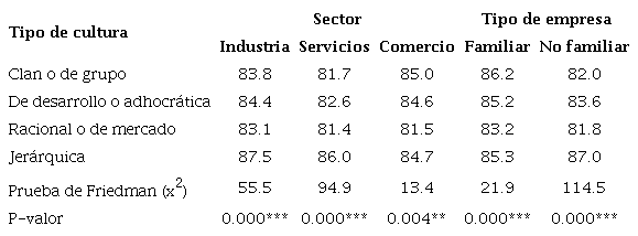 Para comparar los puntajes totales por tipo de cultura, se aplicó la prueba de Friedman debido a que no se clasificaron las empresas en una única cultura, sino que para cada una se calculó un índice [0.100], con lo cual los datos se consideran pareados. Esta prueba permitió establecer que hay diferencias significativas en los puntajes promedio. Específicamente, con la prueba de Wilcoxon se hicieron comparaciones pareadas y se obtuvo que solamente se pueden considerar homogéneos los puntajes para las culturas adhocrática y clan, esto es, se puede decir que tienen igual tendencia en la muestra de empresas, mientras que todas las demás parejas de culturas se pueden considerar diferentes entre sí. Retomando el ordenamiento, se podría confirmar entonces que, en primer lugar, se encuentra la cultura jerárquica; en segundo lugar, hay una paridad técnica entre la cultura clan y la adhocrática; mientras en último lugar estaría la cultura racional de mercado.