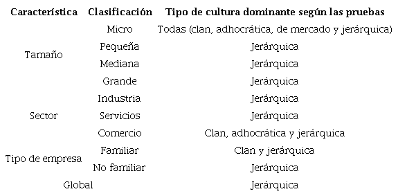 Los resultados revelaron que el modelo de medición usado es consistente y fiable para medir los constructos empleados. Se encontró que la cultura jerárquica es dominante en el conjunto de empresas estudiadas, aunque al dividirlas por ciertos criterios se observaron prevalencias diferentes en algunos de ellos: en las microempresas no hay un tipo de cultura dominante, en el sector comercio prevalecen tres (jerárquica, clan y adhocrática), mientras que en las empresas familiares se halló una paridad técnica entre las culturas jerárquica y clan.