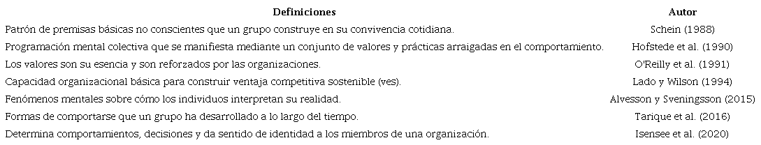 Son diversas las definiciones de la cultura organizacional, en ocasiones contradictorias y con significados complejos, por lo cual no se encuentra un consenso respecto a su concepto y resultados, a pesar de los aportes teóricos y empíricos que se han dado en los últimos años (Chatman & O'Reilly, 2016). En la tabla 1 se ofrece una breve muestra de algunas características de la cultura según distintos autores que da cuenta de la mencionada diversidad.