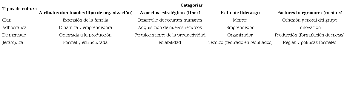 El acercamiento para comprender la cultura se puede hacer desde dimensiones determinadas o mediante tipologías, que son configuraciones construidas a partir de un marco teórico (Scott et al., 2003). Para este estudio se escogió la perspectiva de las tipologías, y el modelo asumido permite identificar cuatro tipos de cultura. La cultura clan, focalizada en la gente, el trabajo en equipo y la cooperación; la cultura adhocrática, centrada en la innovación y el cambio, el crecimiento y el emprendimiento; la cultura de mercado o racional, orientada a resultados, productividad, competitividad y beneficios; y la cultura jerárquica, enfocada en el orden, los procedimientos, la estructura y la calidad (Cameron & Quinn, 1999).