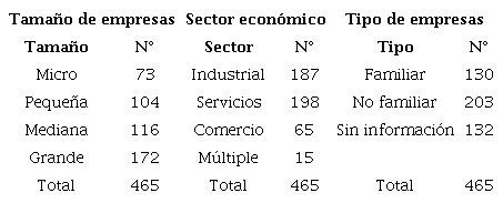 El cuestionario se solicitó a 971 empresas, de las cuales respondieron 465 (tasa de respuesta del 48 %). La muestra incluye diferentes tamaños y tipos de empresas, así como diversos sectores económicos (ver tabla 4), localizadas en 29 departamento del país (considerando a Bogotá, D. C. como si fuese uno).