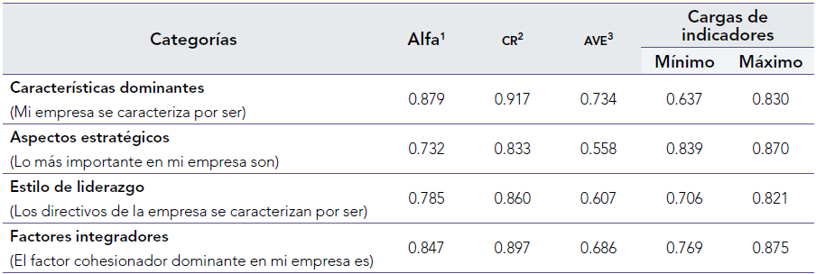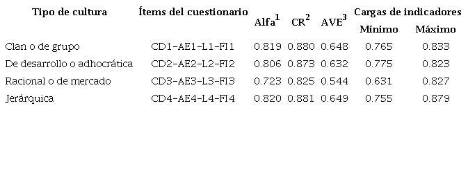 Adicionalmente, debido a que en este artículo se utilizarán como variables latentes los tipos de cultura (no las características), se analizó la consistencia y fiabilidad de los ítems al ser reconfigurados para categorizar la cultura por tipologías. Los resultados presentados en la tabla 6 dan cuenta de que también se obtuvo una consistencia y fiabilidad adecuada al analizar las variables desde esta perspectiva.