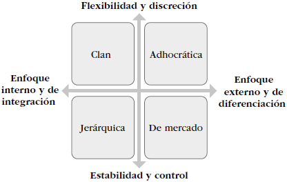 Una perspectiva interesante surge al considerar que en las organizaciones frecuentemente se presentan tensiones o demandas contradictorias. Entre más globales y competitivos sean los entornos y más complejos los procesos internos, estas demandas contradictorias se vuelven más persistentes y las empresas deben estar preparadas para atenderlas simultáneamente (Smith & Lewis, 2011). Un trabajo seminal sobre este aspecto es el de valores en competencia (Quinn & Rohrbaugh 1981), a partir del cruce de las tensiones de la estructura (flexibilidad -control) con el foco (organización -persona) (Quinn & Rohrbaugh, 1983). Posteriormente, Cameron y Quinn (1999) replican el modelo de cultura organizacional basado en la estructura de valores en competencia, dando lugar a una de las tipologías más conocidas de la cultura organizacional que las clasifica en cuatro tipos: clan, adhocrática, de mercado y cultura jerárquica.