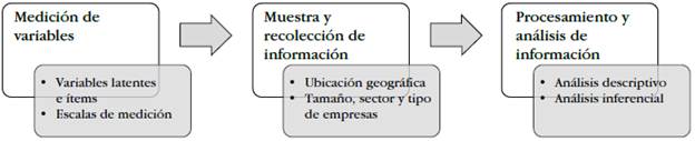 La investigación es de diseño no experimental y el procedimiento general de la investigación se detalla en la figura 2. De acuerdo con el modelo de los métodos de investigación de Craighead y Meredith (2008), la investigación se ubica en el paradigma lógico-positivista-empiricista con la perspectiva 'percepciones de la gente sobre la realidad objeto de estudio'.