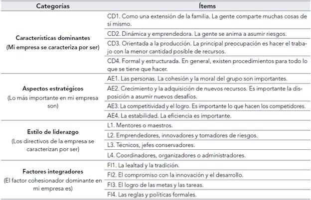 Como se mencionó en la primera sección, se trabajó la variable cultura organizacional con el instrumento OCAI (Organizational Culture Assessment Instrument), desarrollado por Cameron y Quinn (1999) y modificado por Deshpandé et al. (1993), aplicado y validado anteriormente en Colombia (Calderón & Serna, 2009). Los ítems por cada una de las categorías se describen en la tabla 3.