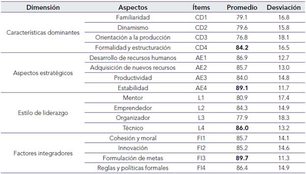 En la tabla 7 se presentan los resultados obtenidos por las diversas dimensiones generales de la cultura que fueron asumidas en el modelo teórico. Se aprecia que, respecto a las características dominantes, la muestra estudiada tiende más a la formalidad y a la estructuración; en cuanto a los aspectos estratégicos, tiende hacia la estabilidad. El estilo de liderazgo que predomina es el técnico y como factor integrador se destaca la formulación de metas (resaltados en negrilla en la tabla).