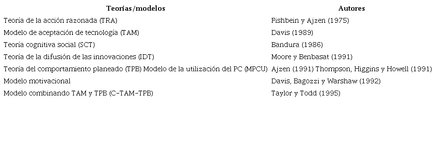 El UTAUT2 es una extensión o ampliación de la teoría unificada de aceptación y uso de la tecnología (UTAUT); tiene el propósito de comprender, explicar y predecir la aceptación y uso de la tecnología en un contexto de consumo (Venkatesh et al., 2012). El modelo UTAUT -modelo de partida para el UTAUT2- pretende predecir la intención conductual de usar y el uso de la tecnología en el entorno organizacional (Venkatesh et al., 2012). Como se observa en la tabla 1, los autores integran en el UTAUT ocho modelos/teorías conspicuas de adopción de la tecnología y comparan los 32 constructos que dichos modelos consideran determinantes de la intención o uso, luego los clasifican, dando como resultado cuatro factores o variables que determinan la intención de uso y el uso de tecnologías (ver figura 1). La teoría consiste en cuatro variables independientes: expectativas de desempeño, expectativas de esfuerzo, influencia social y condiciones facilitadoras. Las tres primeras influyen en la intención de comportamiento o uso, y la cuarta influye directamente en el comportamiento de uso. A su vez, la intención de comportamiento o uso influye en el comportamiento de uso. Se incluyen como moderadores el género, que modera sobre las tres primeras variables; la edad, que modera sobre las cuatro variables; la experiencia, que modera las tres últimas variables; y la voluntad de uso, que modera la tercera variable (Venkatesh et al., 2003).