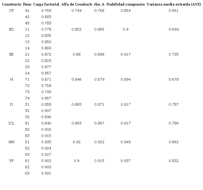 Los valores de la confiabilidad compuesta entre 0.70 y 0.90 van de "satisfactorio a bueno" (Hair et al., 2019); en este estudio los valores oscilan entre 0.854 y 0.949. El Alfa de Cronbach, según estos autores, asume umbrales similares, en este caso ese valor va entre 0.744 y 0.92. Dijkstra y Henseler (2015), citados en Hair et al. (2019), al considerar que el Alfa de Cronbach puede ser demasiado conservador y la fiabilidad compuesta demasiado liberal, propusieron rho_A como una medida aproximadamente exacta de fiabilidad, que generalmente se encuentra entre el alfa de Cronbach y la confiabilidad compuesta, resultados que en la tabla 3 se corresponden con estos valores.