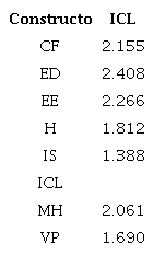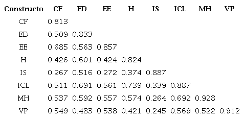 Las cargas factoriales cruzadas de los indicadores de una variable latente con las cargas de los indicadores de las demás variables latentes deben tener mayor valor con su propia variable que con las demás que se evalúan en el modelo, como lo evidencian los resultados encontrados (tabla 5).