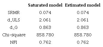 Los resultados del modelo PLS pueden ser evaluados globalmente (modelo general). El criterio de ajuste del modelo global es la normalización de raíz cuadrada media residual (SRMR). Se considera un modelo con un adecuado ajuste cuando los valores son normales a 0.08; un modelo correctamente especificado implica valores SRMR superiores a 0.06 (Martínez & Fierro, 2018). El valor arrojado en este estudio para el SRMR de 0.074 se ajusta totalmente a esta especificación. En la tabla 9 se presenta este valor junto con otros estadísticos de ajuste del modelo global.