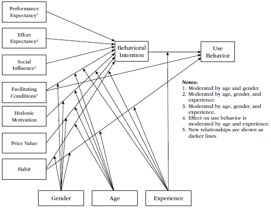 Para el UTAUT2, los autores Venkatesh et al. (2012) agregan al UTAUT tres nuevos factores o variables (constructos clave para la adopción y uso del consumidor de tecnologías identificadas de investigaciones previas, en palabras de los autores): motivación hedónica, valor de precio y hábito, que influyen sobre la intención de comportamiento o uso, quedando el nuevo modelo (UTAUT2) conformado por siete variables: expectativas de desempeño, expectativas de esfuerzo, influencia social, condiciones facilitadoras, motivación hedónica, valor de precio y hábito, y agregan nuevas relaciones con respecto al UTAUT estableciendo que las condiciones facilitadoras influyen también sobre la intención de comportamiento o uso, y que el hábito influye sobre el comportamiento de uso. Como moderadores están la edad, el género y la experiencia (ver figura 2).