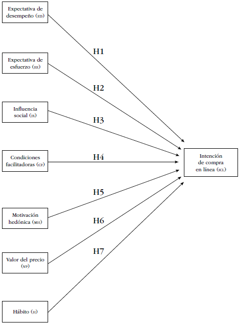 Se utilizó el modelo UTAUT2 como marco de referencia para identificar los factores determinantes para la intención de compras en línea por parte de los consumidores. Los ítems que conforman las diferentes variables del UTAUT2 se conservaron en su totalidad y se adaptaron al campo de las compras en línea (anexo). Investigaciones previas que emplean este modelo teórico recomiendan el uso de las ecuaciones estructurales, para lo cual se utilizó el enfoque PLS-SEM (Benitez et al., 2020; Martínez & Fierro, 2018).
